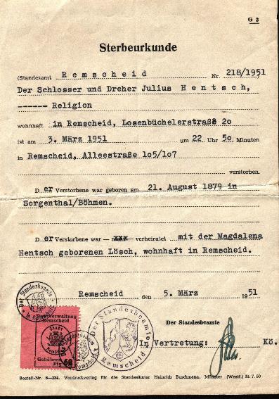 | verstorben am 03.03.1951 ( 22.50 Uhr ) in Remscheid | 05. November 1957 in Wuppertal |